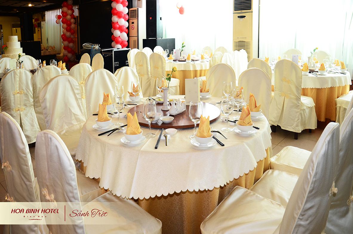 Nằm bên trong khách sạn Hòa Bình, gồm hai sảnh lớn, mỗi sảnh phục vụ hơn 300 khách. Khung cảnh sang trọng và ấm cúng. Phục vụ đến quí khách các món ăn Âu – Á, Hoa, Việt với phong cách riêng của Khách sạn Hòa Bình. Sảnh cưới được trang trí sang trọng với nhiều tiện nghi hiện đại. Bên cạnh đó, với đội ngũ quản lý có năng lực, đầu bếp chuyên nghiệp, tay nghề cao cùng với hệ thống nhân viên được đào tạo bài bản, quý khách đến đây sẽ hoàn toàn hài lòng với cung cách phục vụ nhanh nhẹn, ân cần, chu đáo cũng như thật sự ngon miệng trong từng bữa tiệc với chất lượng, sự đa dạng, phong phú và hấp dẫn của thực đơn.